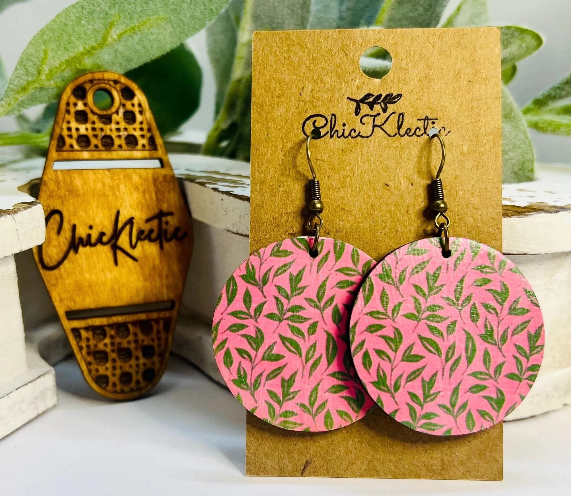 Boho Emerald & Pink Floral Sublimated Wood Earrings >1 1/2” w x 1 1/2” h >Made from laser cut 1/8” basswood. They are super lightweight and comfortable to wear. >The front is a sublimated imaged onto wood and the back is stained in walnut. >Sealed with a clear coat. >Earring hooks are hypoallergenic.
