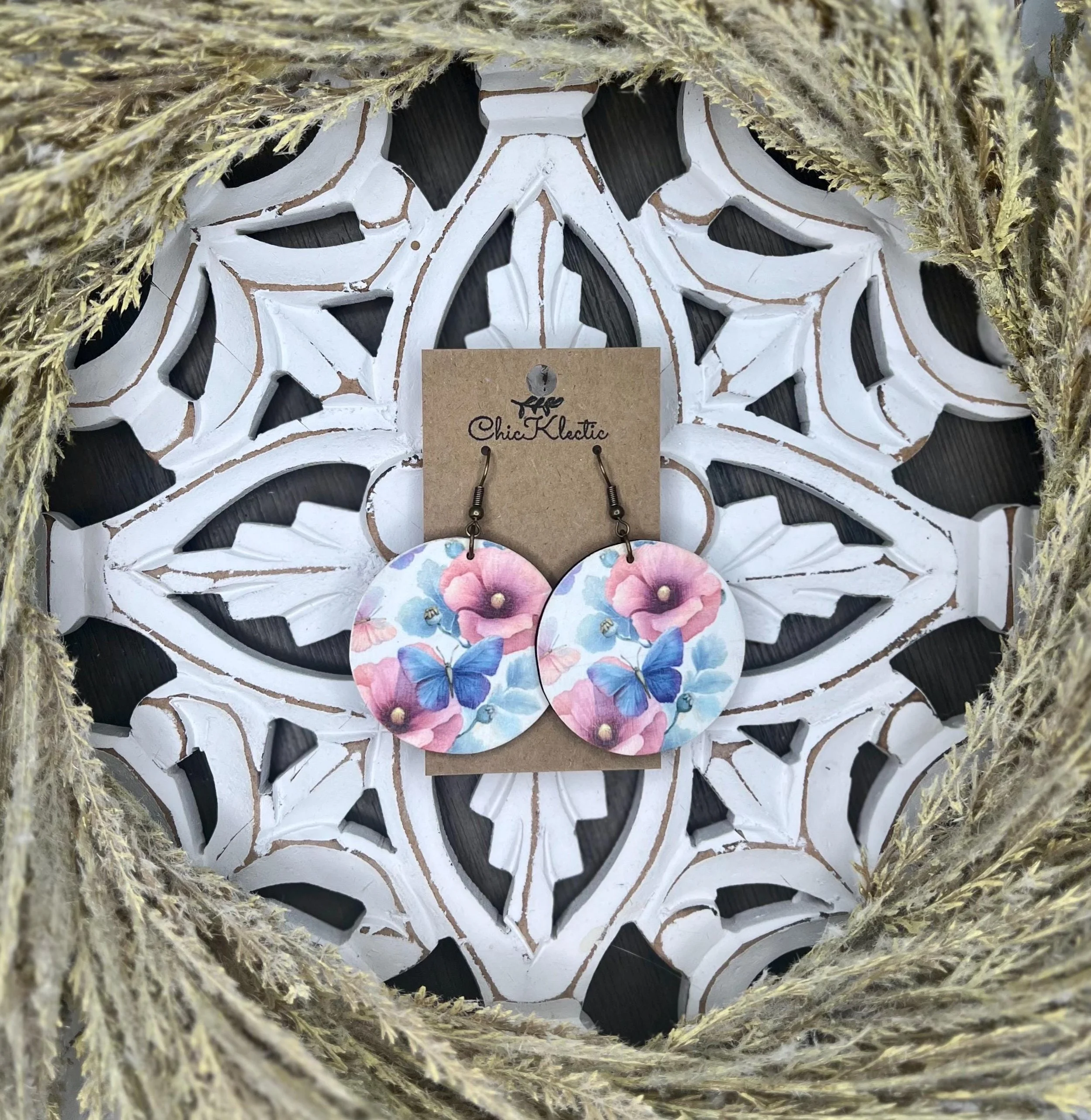 Butterfly Petunia Watercolor Floral Print Sublimated Wood Earrings >1 3/4” w x 1 3/4” h >Made from laser cut 1/8” basswood. They are super lightweight and comfortable to wear. >The front is a sublimated imaged onto wood and the back is stained in an oak color. >Sealed with a clear coat. >Earring hooks are hypoallergenic.