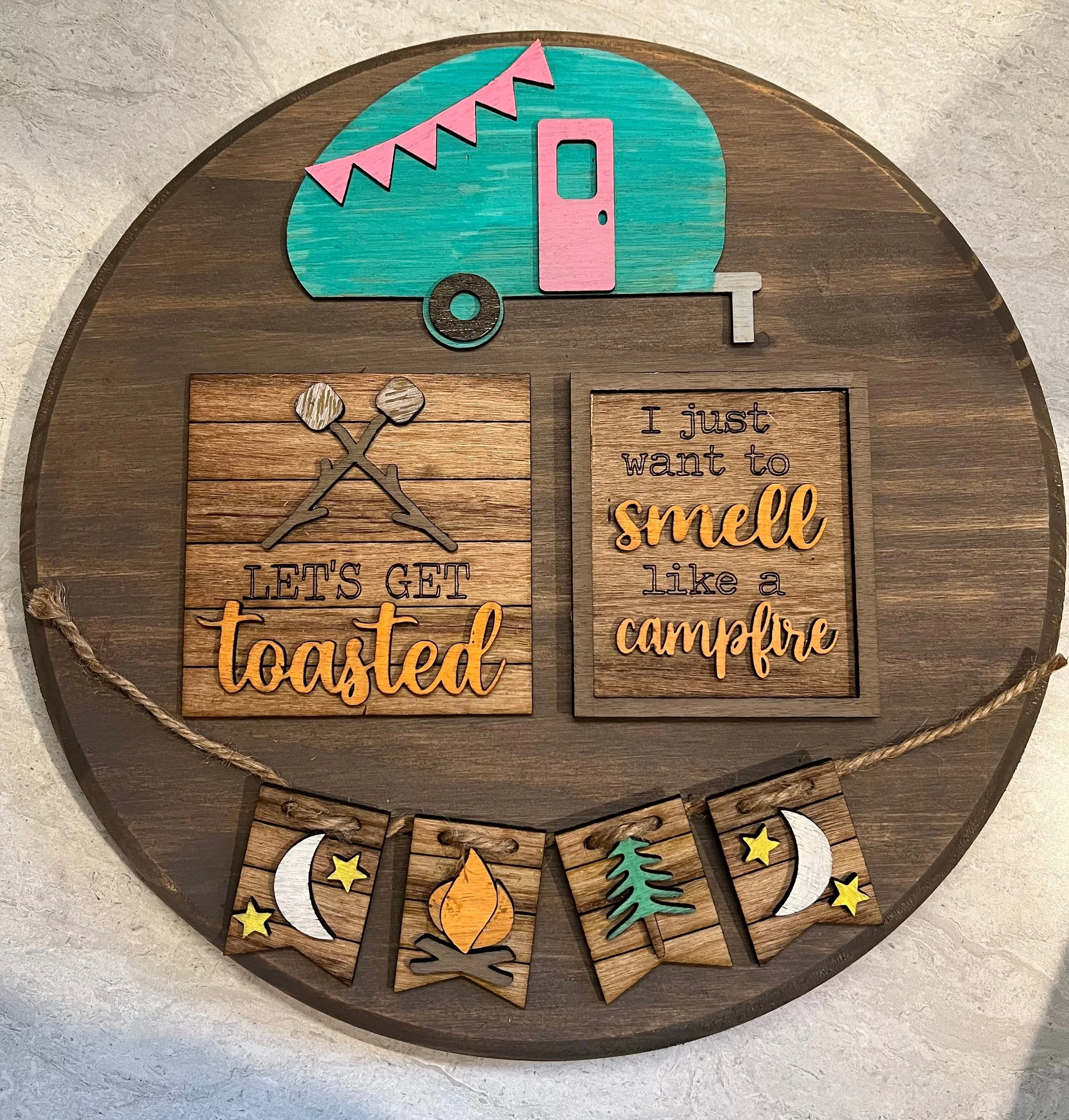 “Let’s Get Toasted” sign with crossed marshmallow sticks “I just want to smell like a campfire” quote sign Mini wood tiles with campfire, trees, and moon accents Adorable camper piece for the perfect finishing touch