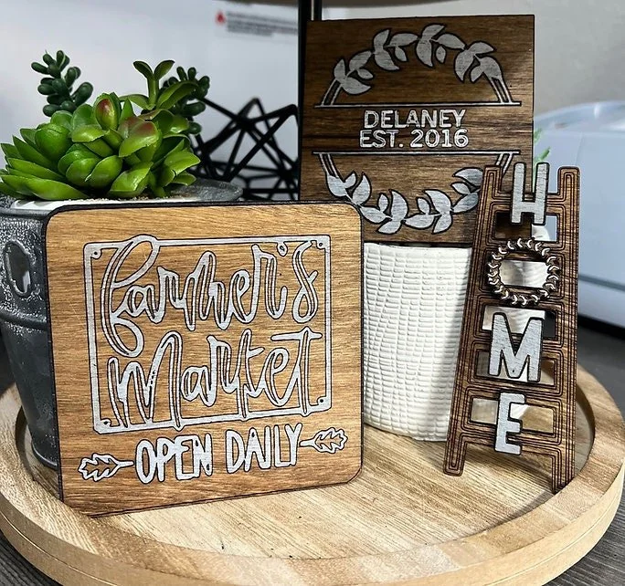 Handcrafted Farmhouse Tier Tray Decor Set | Rustic Wood Signs, Custom Name, Est. Date