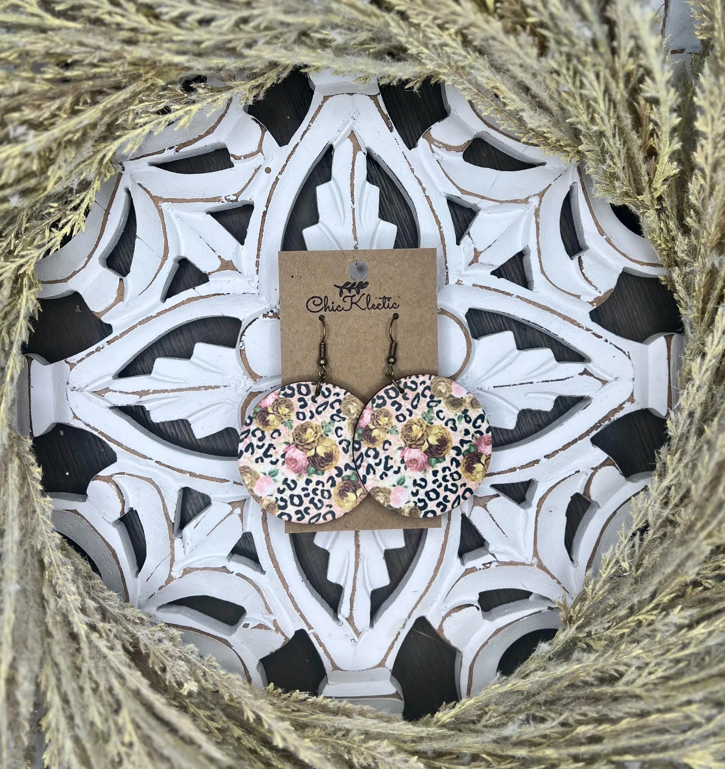 Rose Gold Leopard Floral Print Sublimated Wood Earrings >1 3/4” w x 1 3/4” h >Made from laser cut 1/8” basswood. They are super lightweight and comfortable to wear. >The front is a sublimated imaged onto wood and the back is stained in an oak color. >Sealed with a clear coat. >Earring hooks are hypoallergenic.