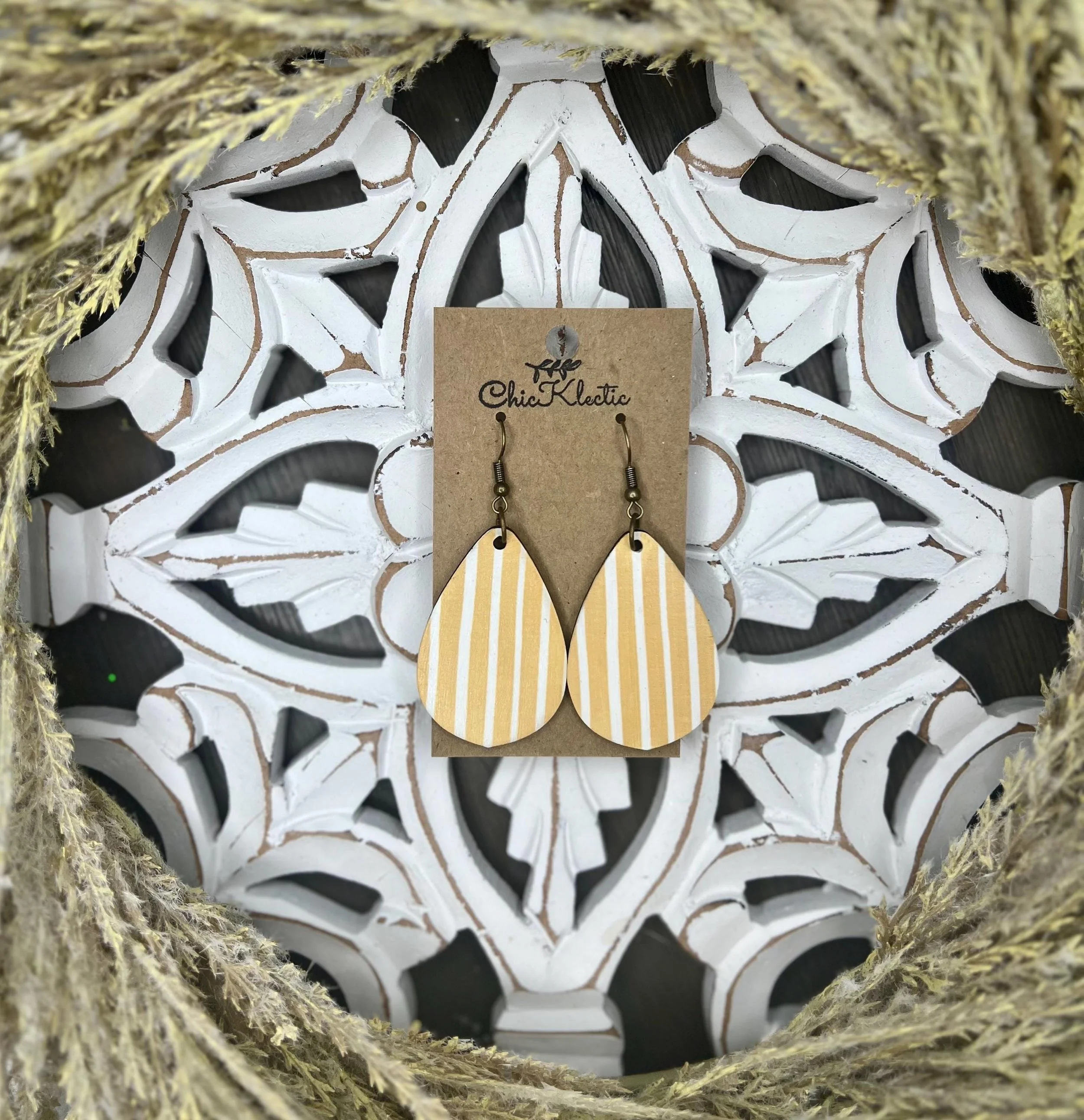 Striped Yellow & White Print Sublimated Wooden Earrings >1 1/4” w x 1 3/4” h >Made from laser cut 1/8” basswood. They are super lightweight and comfortable to wear. >The front is a sublimated imaged onto wood and the back is stained in an oak color. >Sealed with a clear coat. >Earring hooks are hypoallergenic.